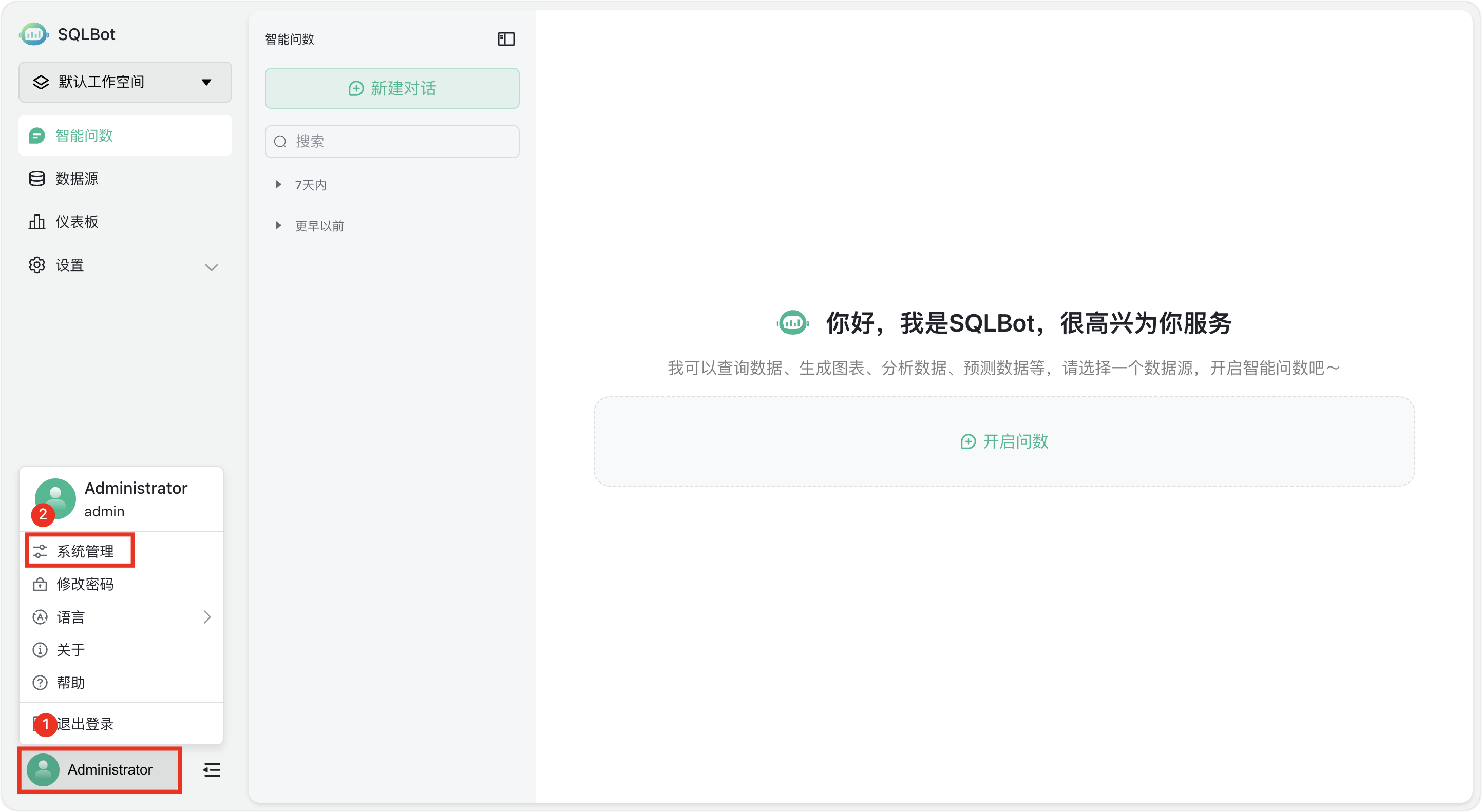 首先,在SQLBot中创建一个高级应用,点击SQLBot首页左下角的用户名,在弹出的选项菜单中选择“系统管理”选项;