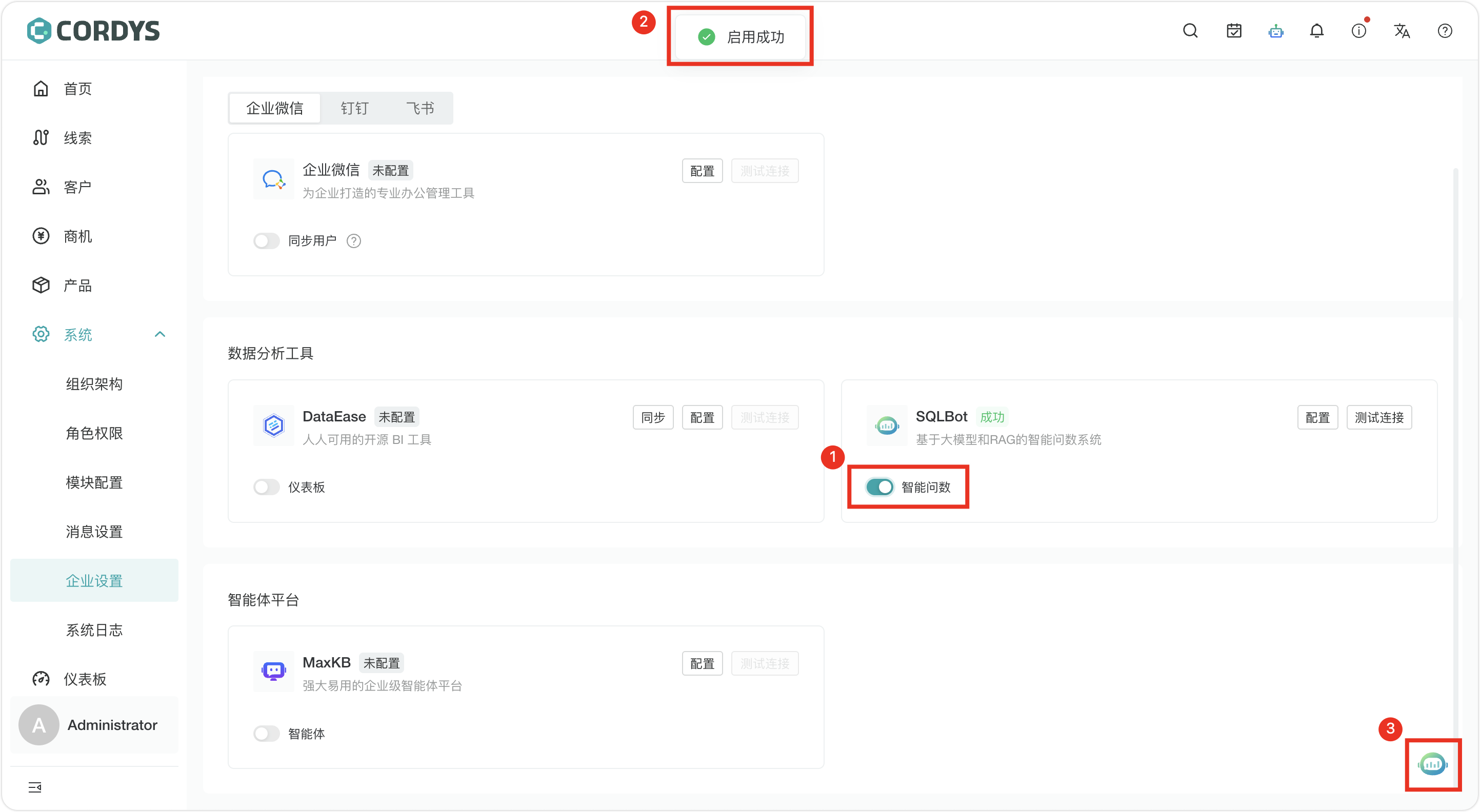 在Cordys CRM的“企业设置”页面的“数据分析工具”栏目中,打开SQLBot图标下方的“智能问数”开关,页面上方会弹出“启用成功”的提示语。此时,我们就可以在Cordys CRM页面右下角看到SQLBot的悬浮图标了。该图标是用户访问“销售智能问数系统”应用的入口,点击该图标,用户就可以在Cordys CRM中进行智能问数了。