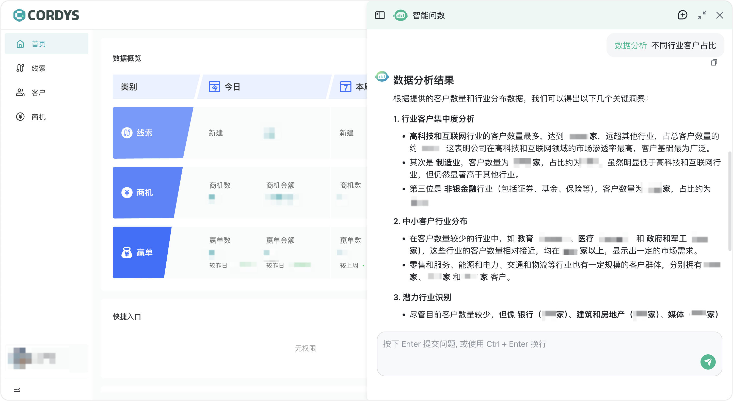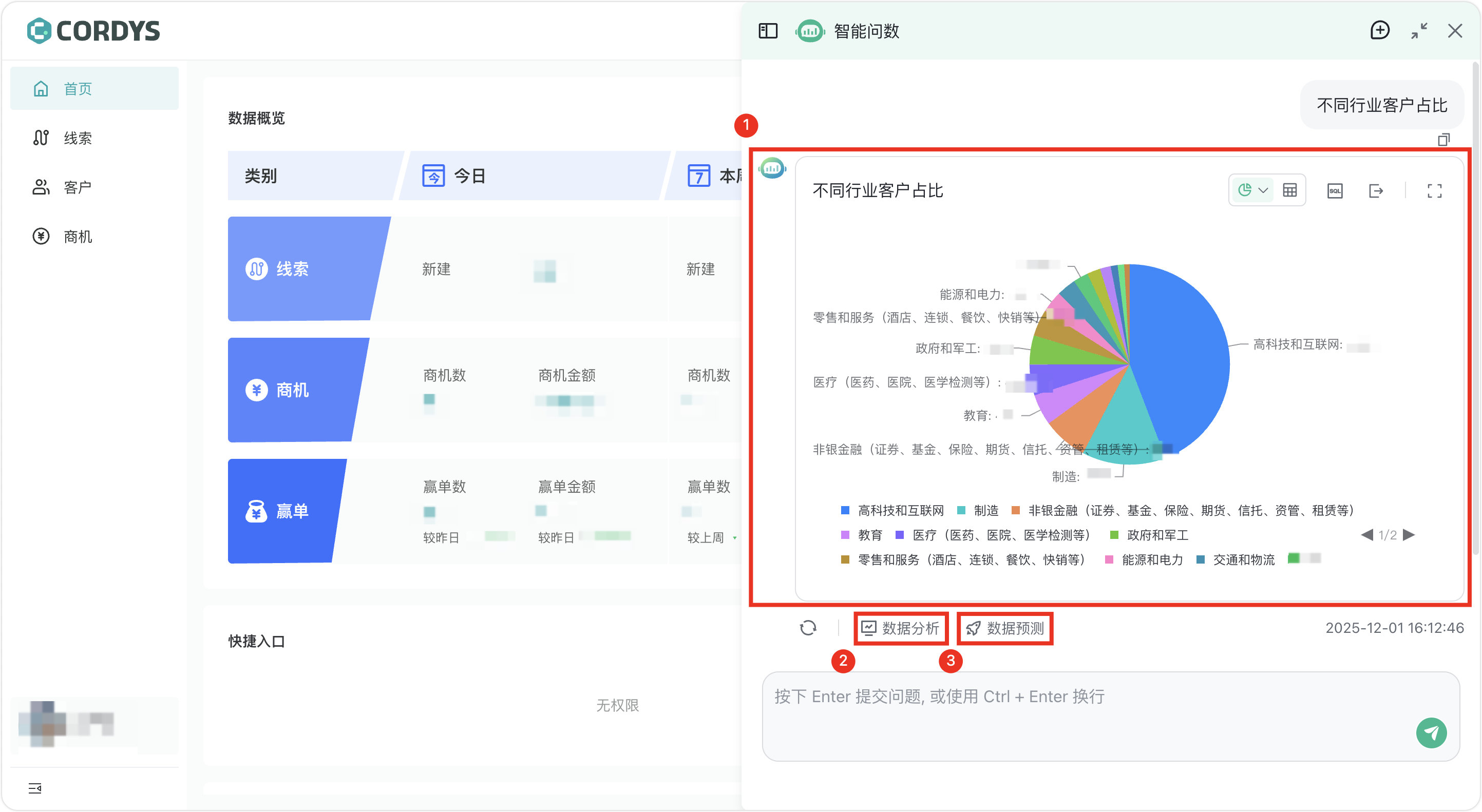 我们现在以“不同行业客户占比”这个问题为例,尝试进行智能问数。可以看到,“销售智能问数系统”应用能够用清晰的图表回答问题。除此以外,在回答下方,还有“数据分析”和“数据预测”两个按钮,点击对应按钮,“销售智能问数系统”应用还可以对本次回答的数据结果开展更深一步的分析洞察。