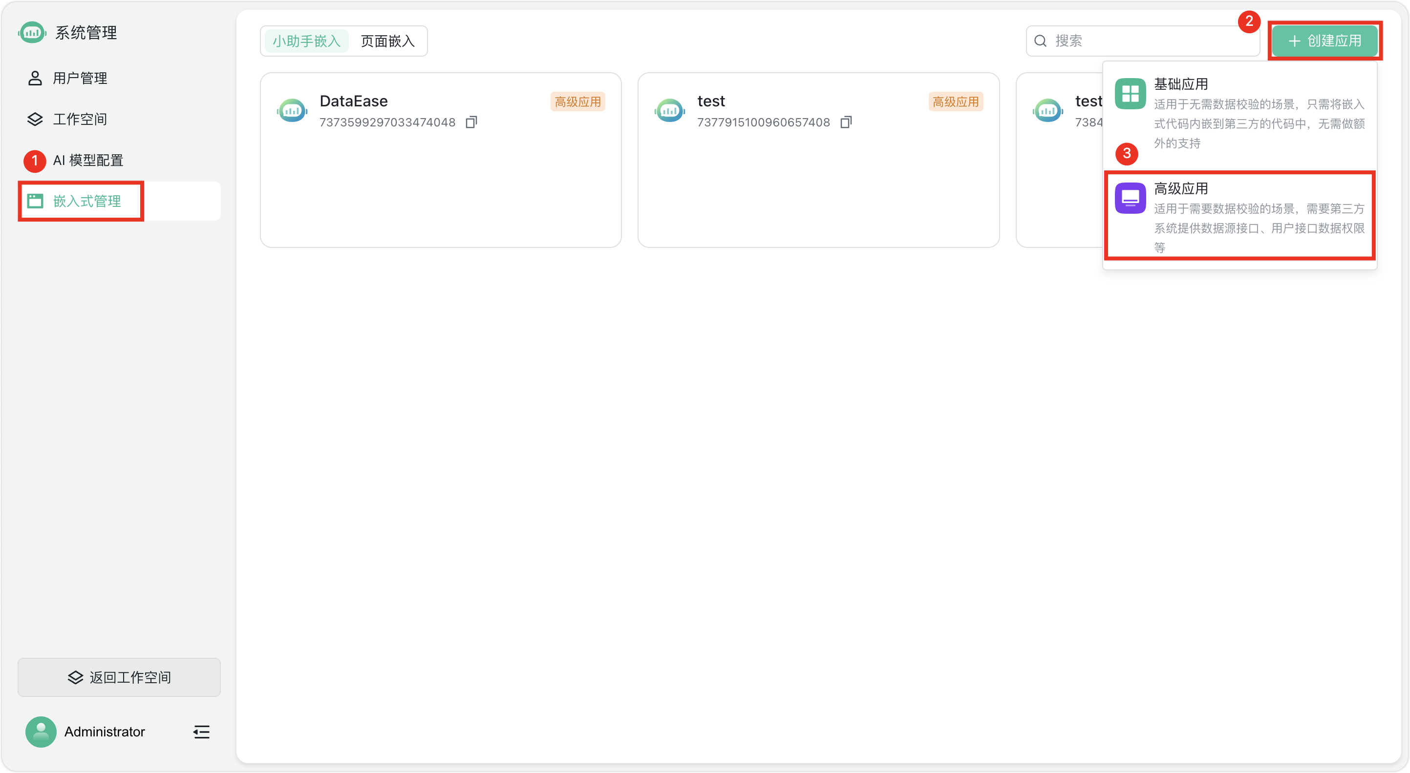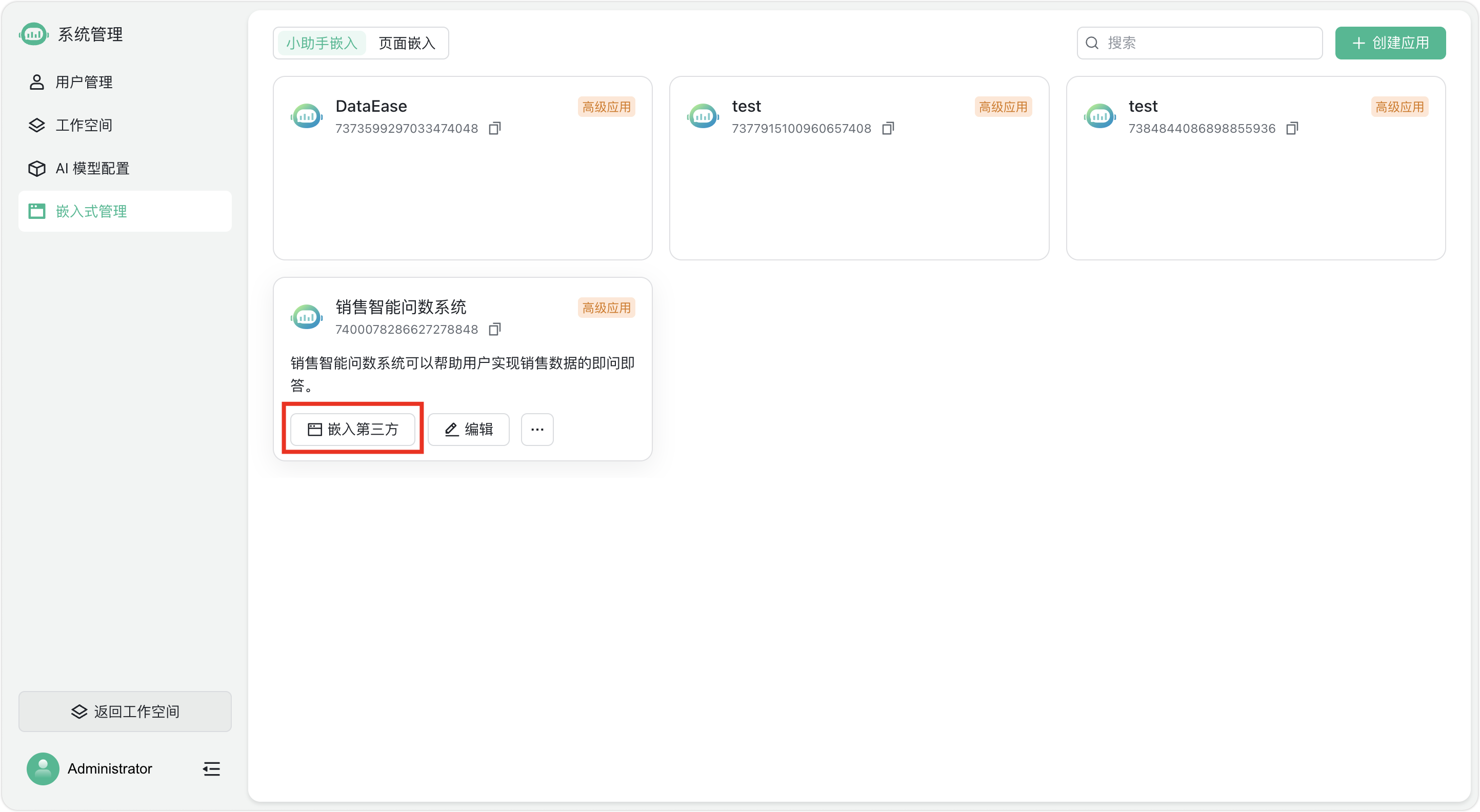然后,在“系统管理”菜单栏中选择“嵌入式管理”选项,即可看到在SQLBot中当前已经创建的各种嵌入式应用。点击页面右上角的“创建应用”按钮,选择“高级应用”选项即可进入高级应用的创建流程