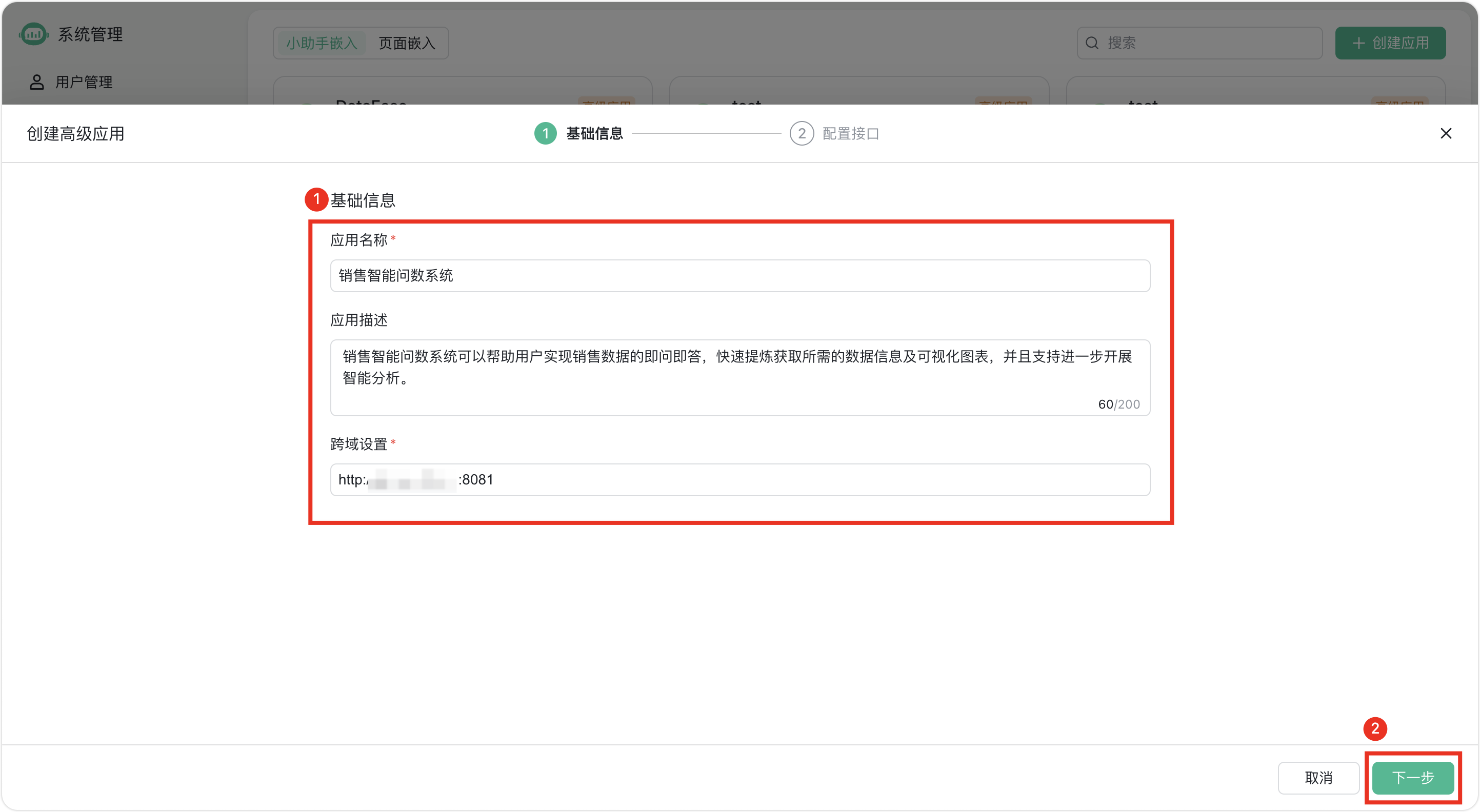 在“基础信息”步骤需要填写“应用名称”、“应用描述”和“跨域设置”三个字段,此处我们将该高级应用命名为“销售智能问数系统”。特别需要注意的是,对于“跨域配置”字段,应该填写已经部署好的Cordys CRM的访问地址。此外,为了避免出现跨域异常访问的情况,建议Cordys CRM与SQLBot的访问地址格式保持一致,即Cordys CRM与SQLBot均使用域名或IP地址作为其访问地址。