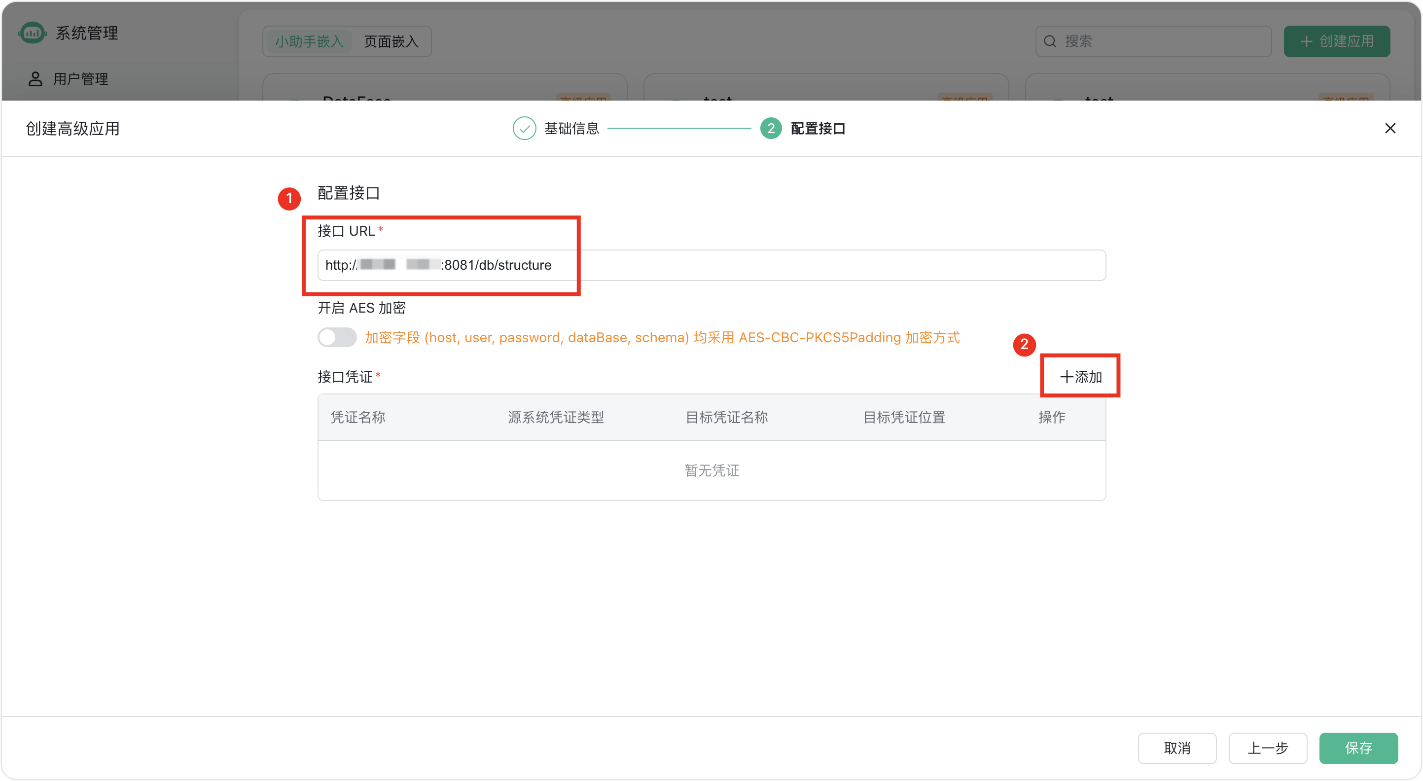 在“配置接口”这一步骤里,需要填写“接口URL”字段,并且添加“接口凭证”信息,以完成与Cordys CRM的对接。“接口URL”字段需要填写Cordys CRM的部署地址,即http://CordysCRM-URL/db/structure。注意:只需将CordysCRM-URL替换为自己的Cordys CRM部署地址即可。