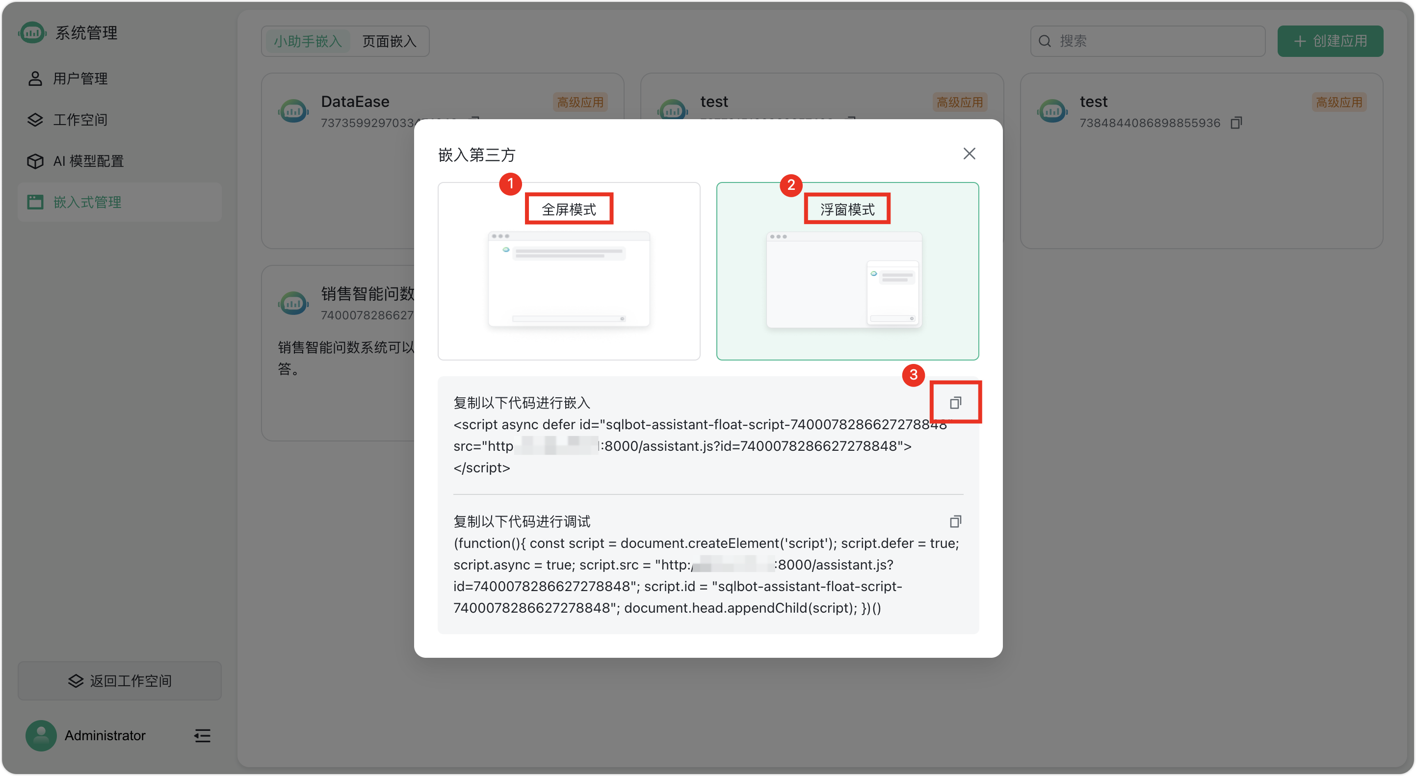 SQLBot提供了“全屏模式”和“浮窗模式”两种模式的嵌入代码。这里我们以“浮窗模式”为例,选择“浮窗模式”样式,点击“复制以下代码进行嵌入”文字右侧的复制按钮,即可一键复制“浮窗模式的嵌入码