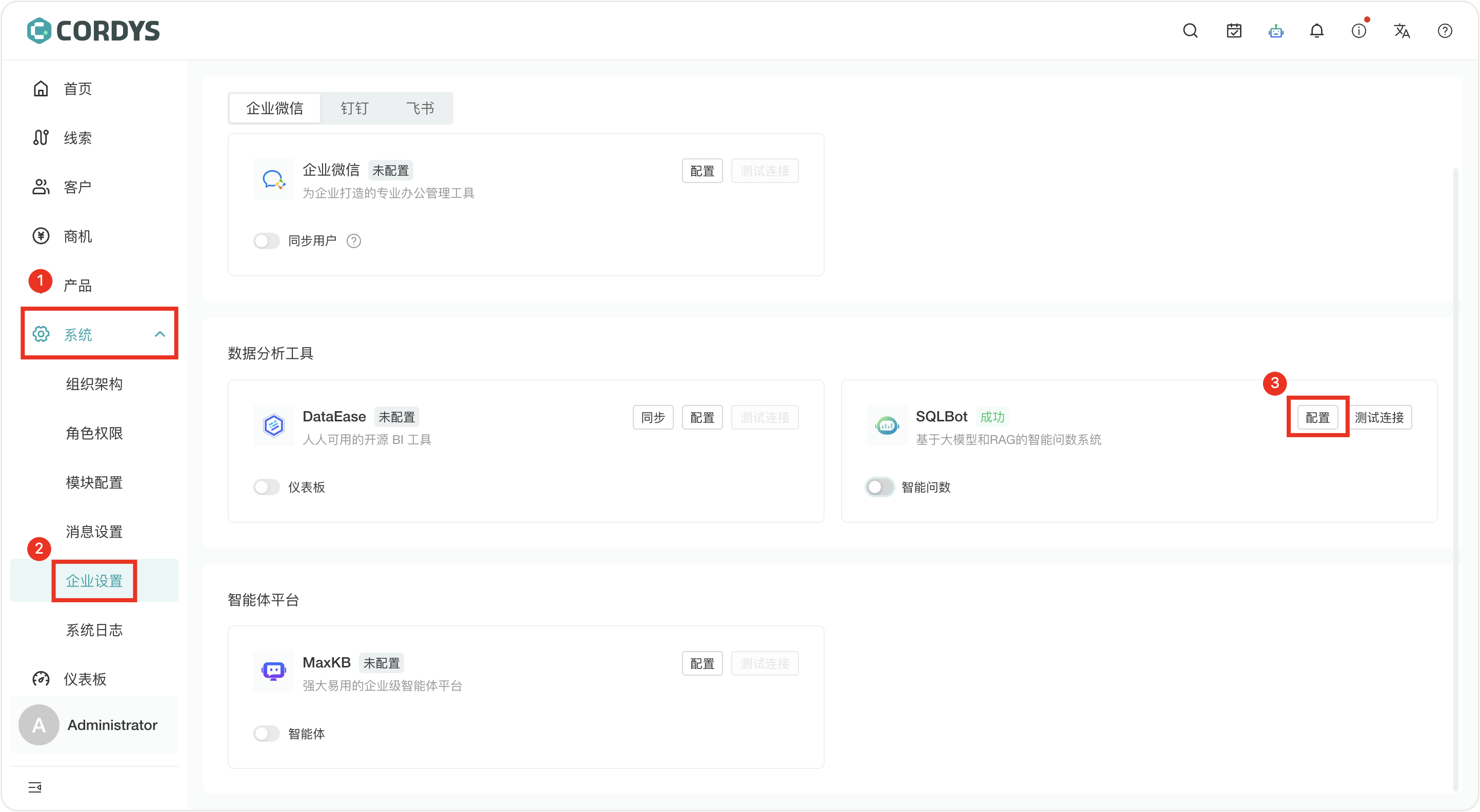 准备好嵌入代码后,我们来到Cordys CRM中。点击Cordys CRM操作界面左侧菜单栏中的“系统”选项,在下拉菜单中选择“企业设置”选项,在右侧的“数据分析工具”栏目中可以看到SQLBot的相关设置情况。点击SQLBot的“配置”按钮,系统弹出“SQLBot配置”对话框。