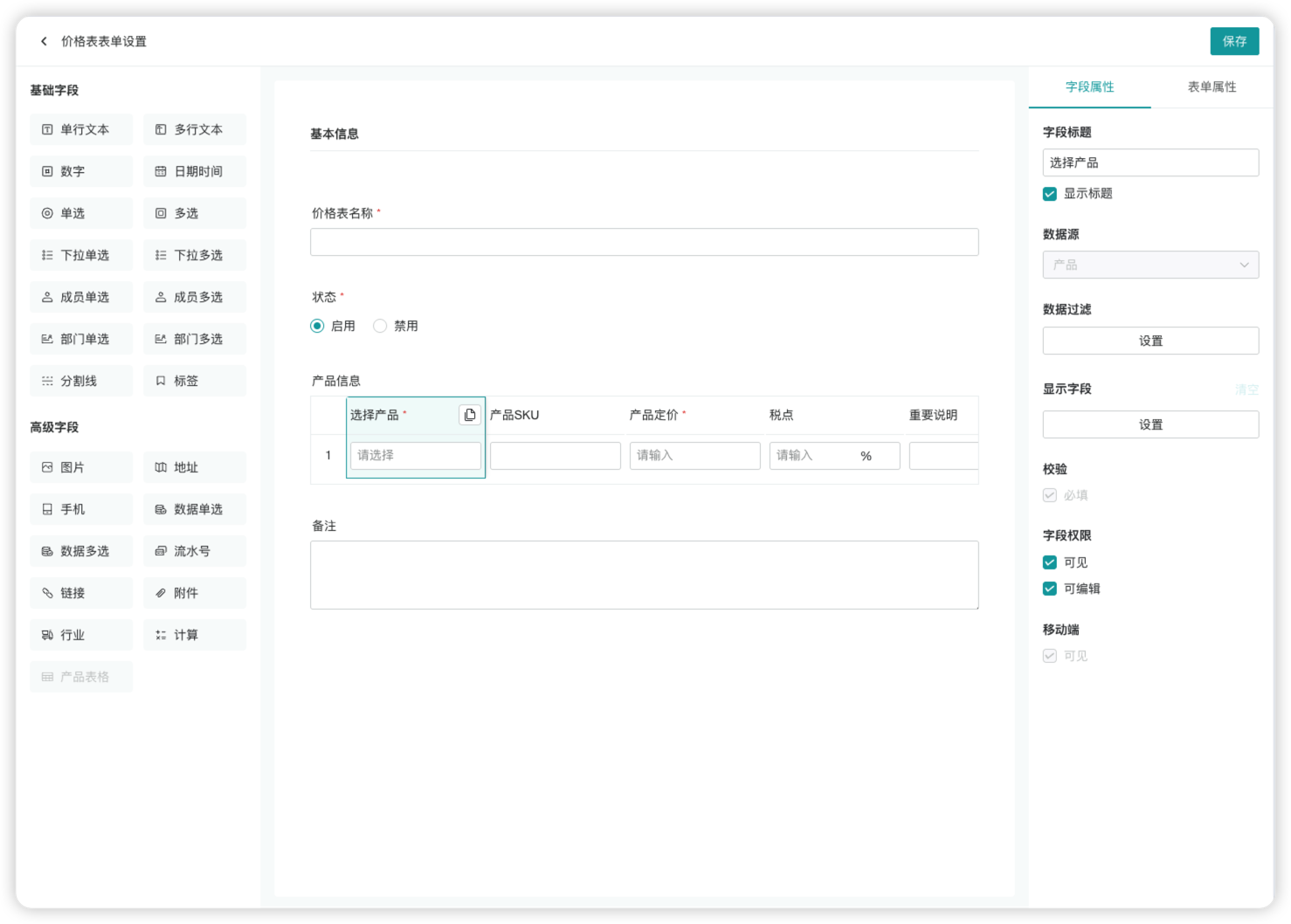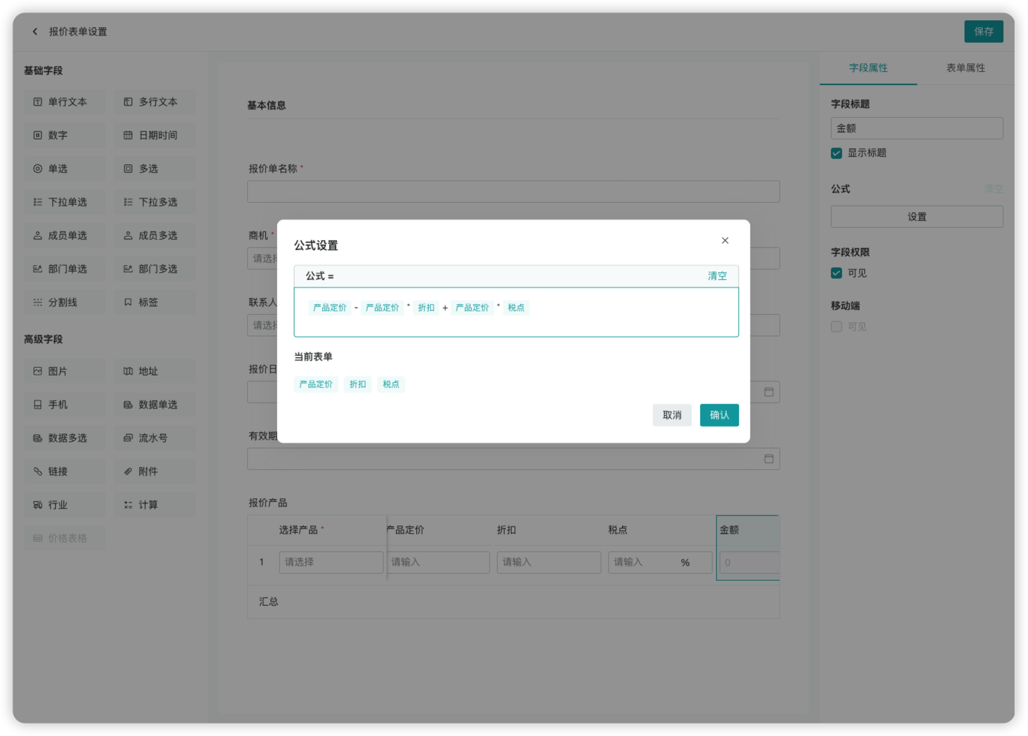 关联价格表方面,用户可以自行设置要关联的价格表,实现在填写报价单时产品价格的自动填充;金额计算规则方面,用户可以对产品定价、折扣和税点等金额计算要素通过运算符组合实现金额计算规则的调整,从而适配不同业务场景的报价需求。借助这两个设置项,用户可以设计出符合自身实际业务需求的报价单,有效提升销售报价的效率与规范性。