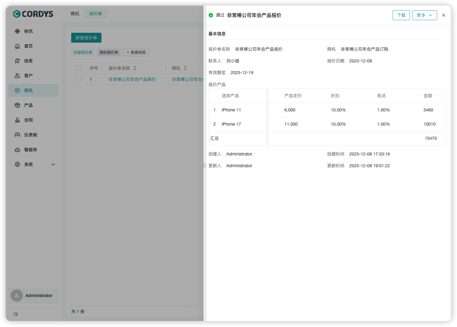 同样,Cordys CRM的报价单功能也内置了简易的审批流程。销售人员提交报价单后,拥有审批权限的用户可以进行审批,审批结果会根据用户设置的消息通知方式发送给报价单提交人,审批通过的报价单支持下载。