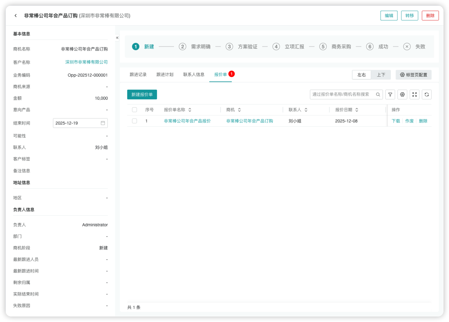 此外,报价单还可以同步关联商机和合同,商机详情页支持查看当前商机关联的全部报价单。