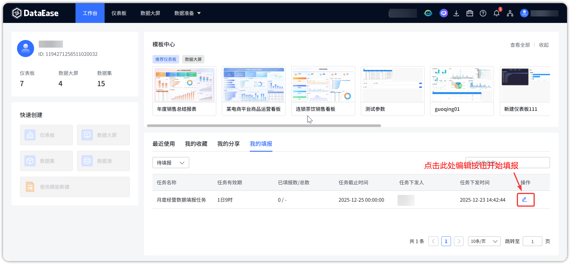 ① 登录子公司填报人员的账号,在DataEase首页工作台中“我的填报”页面,可以看到总公司下发的数据填报任务;