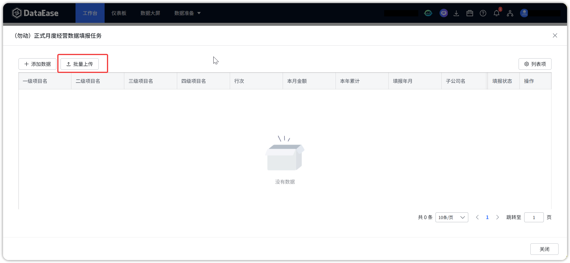 ② 点击任务右侧的“编辑”按钮,即可进行数据填报,填报人员可以在DataEase中直接添加数据,也可以选择批量上传数据;