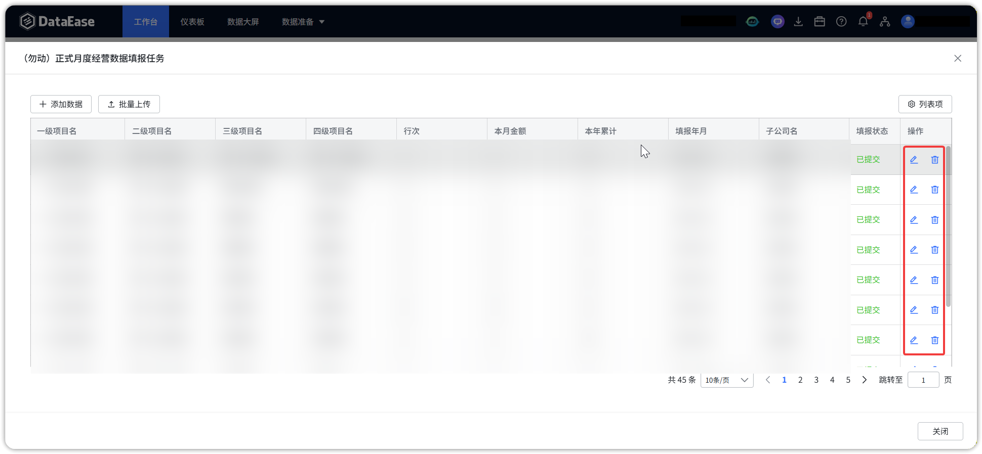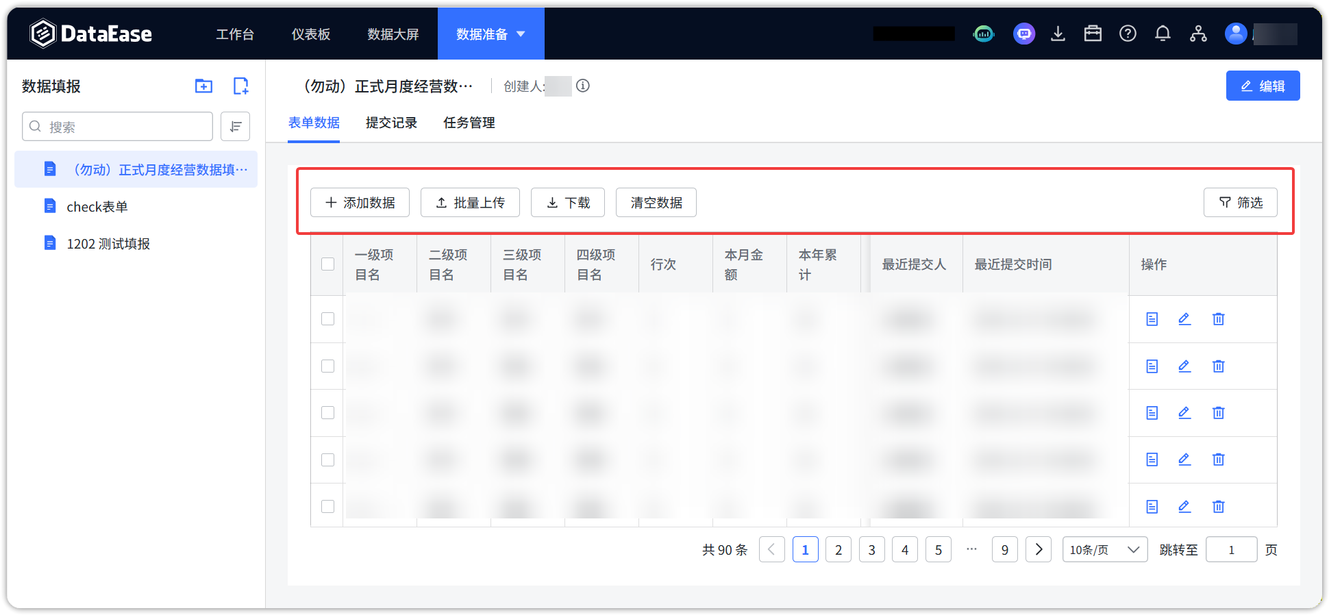 ③ 如果填报人员需要修改已经提交的数据,可以在“数据填报”页面进行单行数据修改,也可以由总公司的DataEase管理员在“数据填报”目录下的“表单数据”页面进行批量操作。
