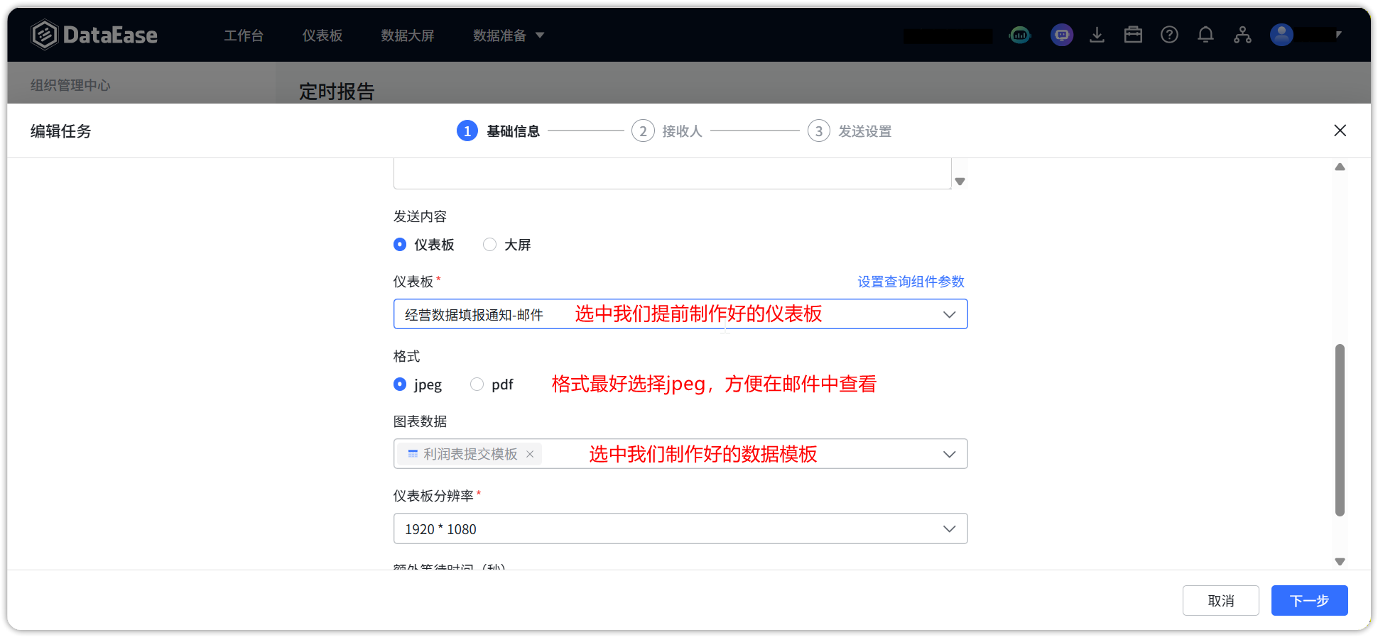 ① 在“基础信息”页面的“图表数据”栏目中,选中数据填报教程仪表板中的明细表视图,此明细表会导出为Excel模板,作为定时报告的附件一并发送;