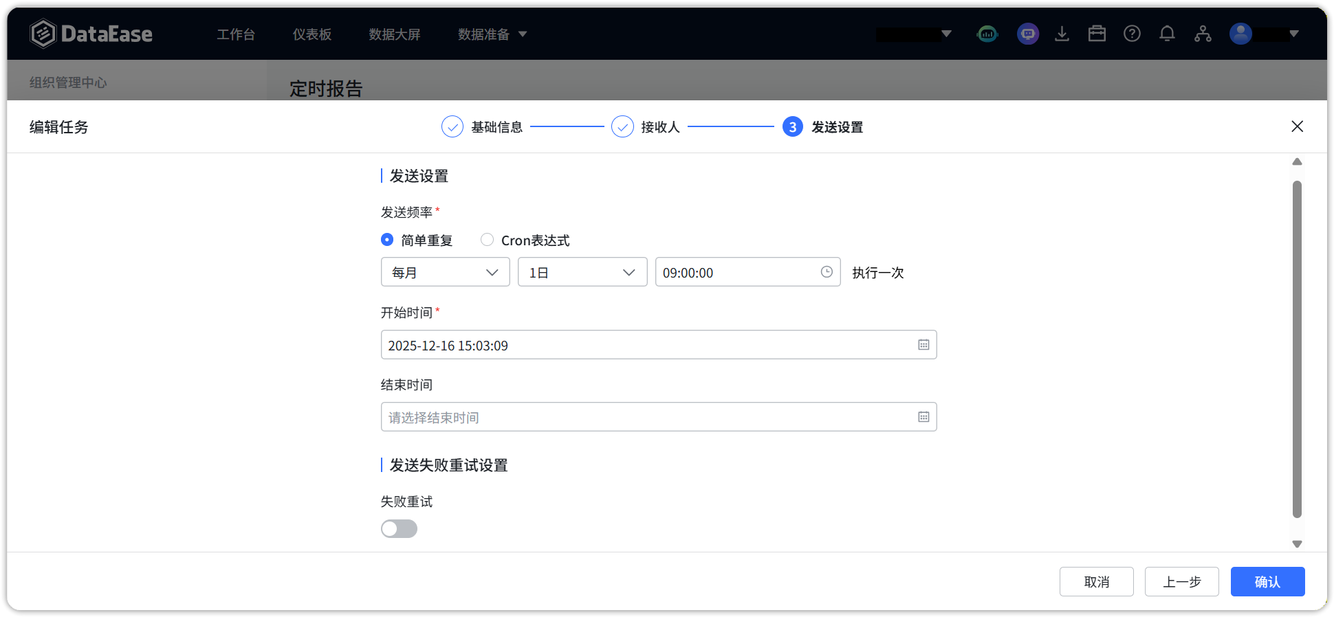 在DataEase“组织管理中心”菜单选择“定时报告”选项,在“定时报告”页面可以创建一个定时报告任务,并配置任务信息。具体步骤如下: