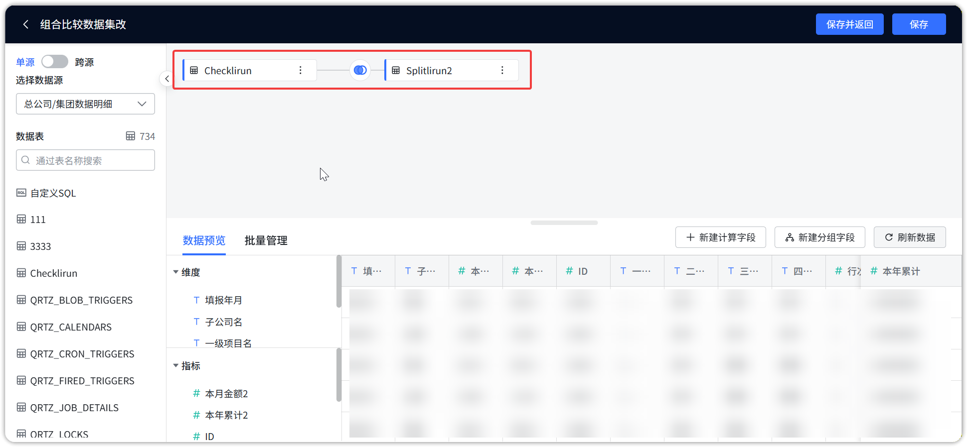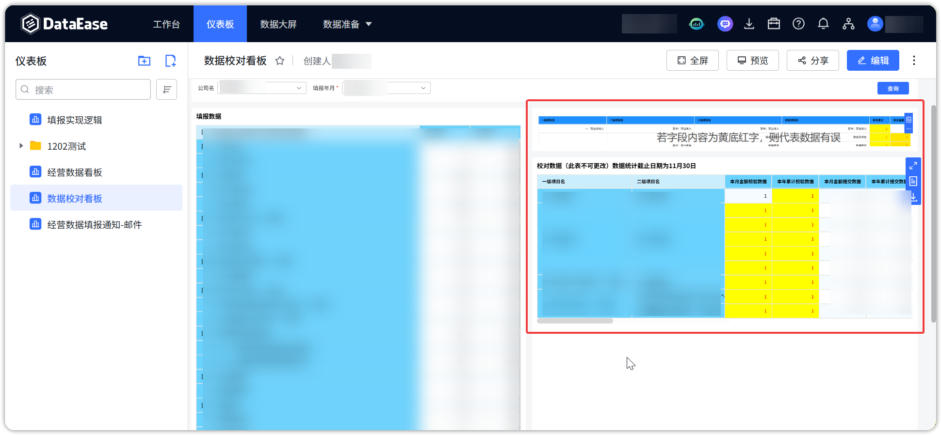② 新建一个数据校对仪表板,在仪表板中使用提前准备好的关联数据集制作表格图表,用报表的形式集中呈现各分公司提交的填报数据;