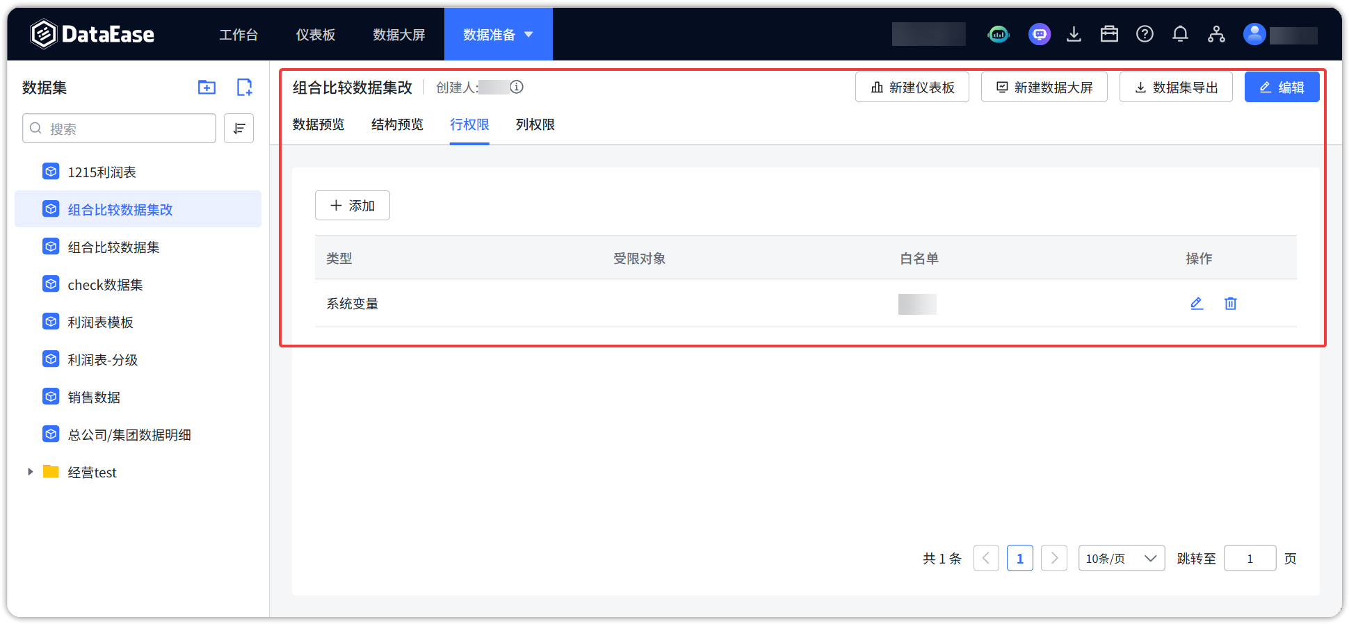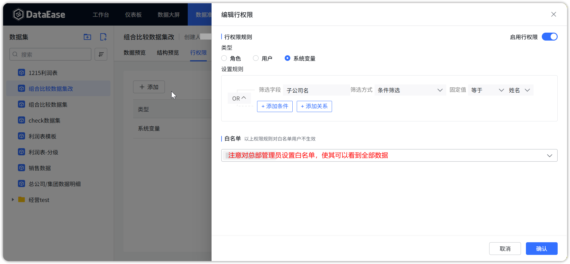 在DataEase的“数据准备”菜单下,设置数据集的行列权限,确保各个分公司的填报人员在通过数据集或大屏查看数据时,只能看到自己所填报的数据。需要注意的是,数据行列权限需要对总部管理员设置白名单,使其可以看到全部数据,便于总部对数据的整体管理。