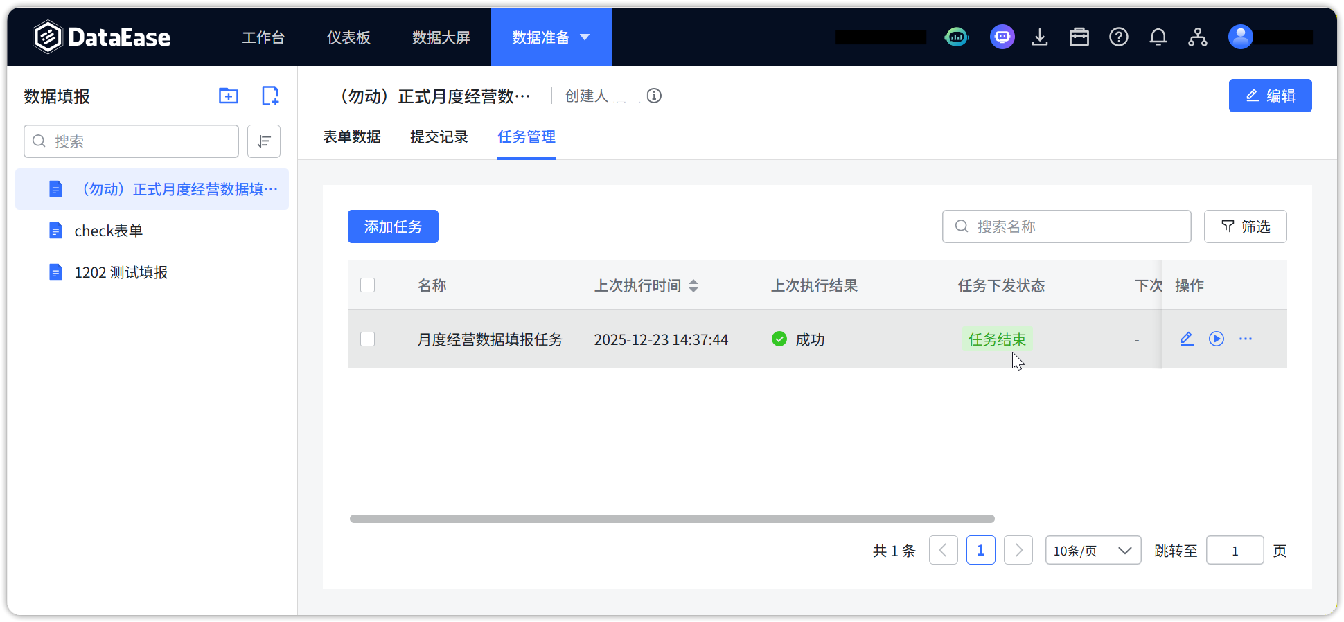 数据填报任务:此任务可以将待填写的数据表单发送至分公司填报人的DataEase账号内,支持定时发送或立即发送;