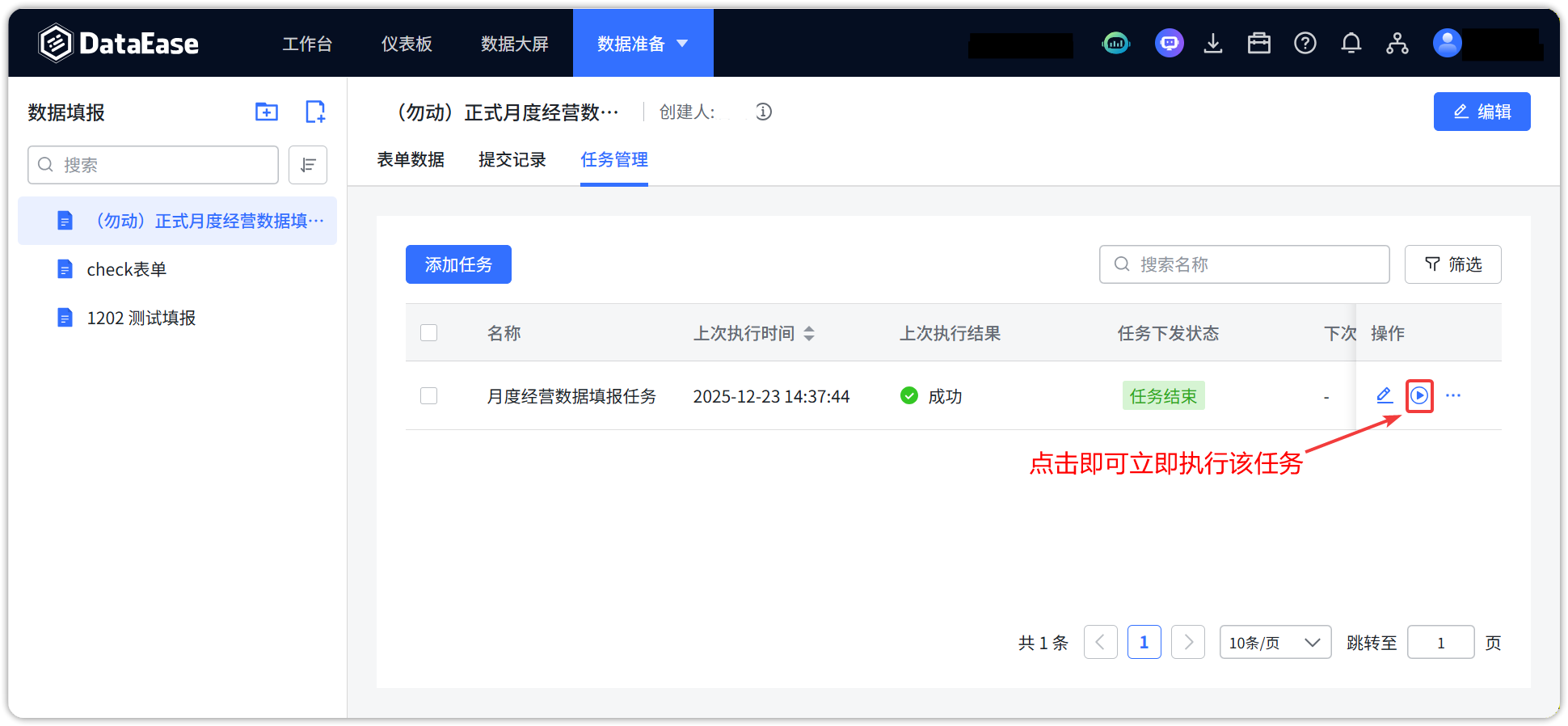 ④ 任务创建完成后,点击任务的“执行”图标按钮,即可立即下发表单填报任务;