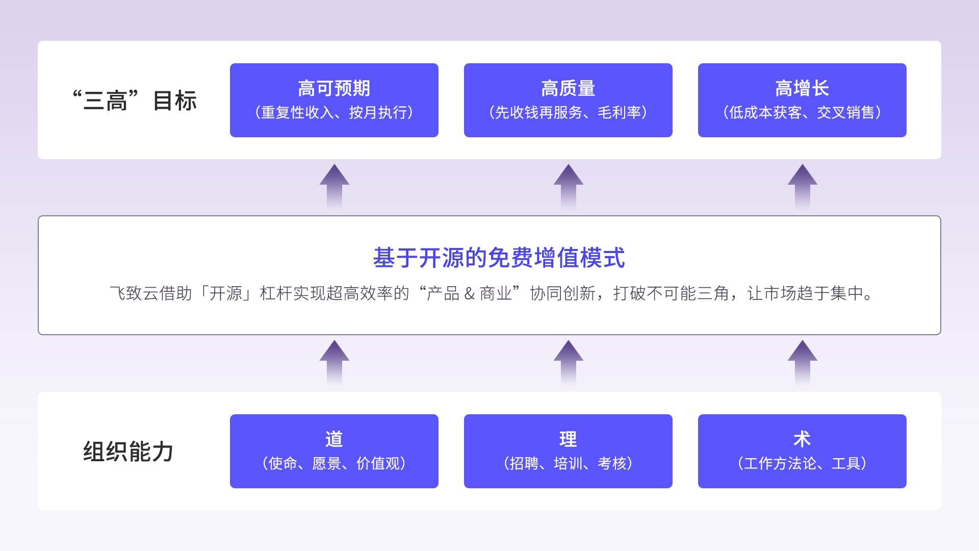 在组织能力之上,围绕着“做成一家优秀软件公司”的目标,去设定一些重点的指标。从飞致云的角度来说,我们期望能够成为一家“三高”的企业,即高可预期、高质量和高增长。