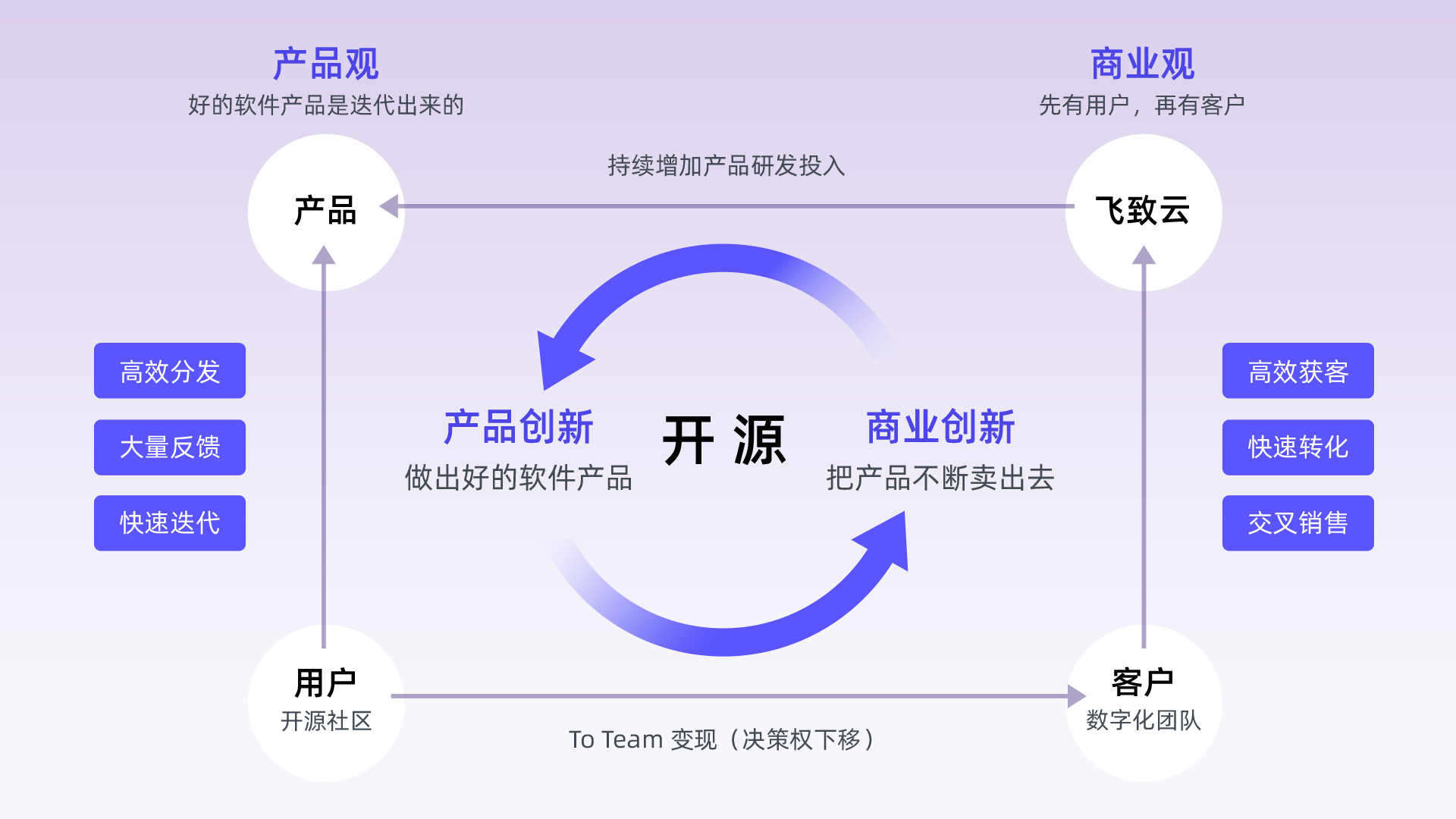 在组织能力和“三高”目标中间,核心的引擎就是“基于开源的免费增值模式”。我们期望借助开源杠杆实现超高效率的“产品&商业”协同创新,打破不可能三角,让市场趋于集中。