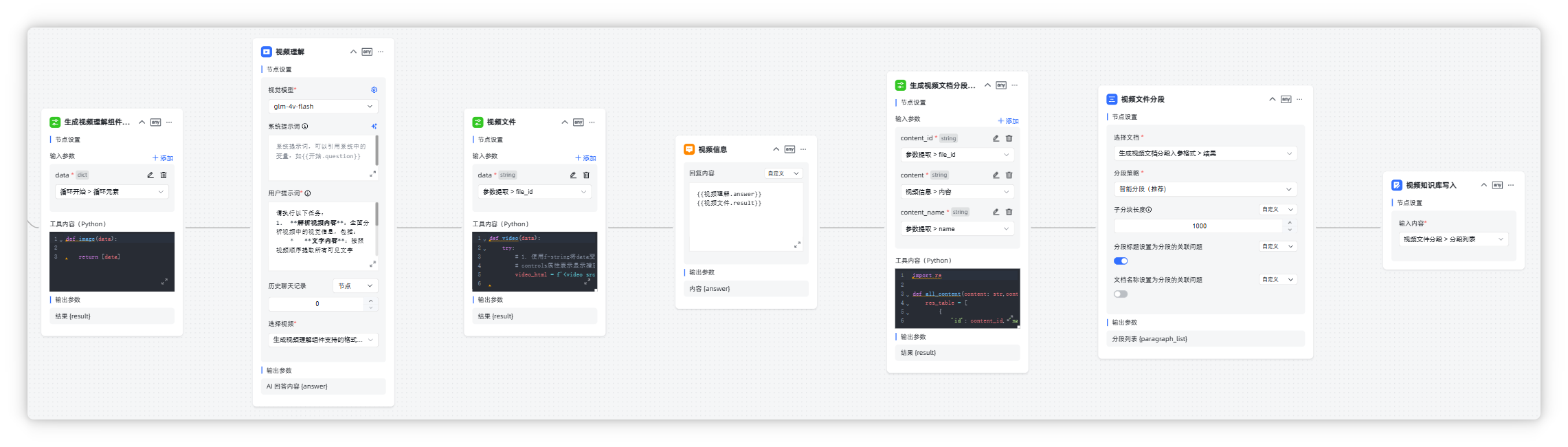 ③ 若为视频文件:调用视频理解组件节点,提取视频的画面与音频融合的文本信息。然后调用自定义工具节点,获取视频原件资源;