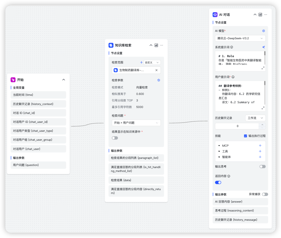 ■ 后端(MaxKB智能体):这是整个系统的大脑。它接收前端请求,完成知识库检索、上下文增强、AI模型调用等任务,并且组织生成高质量的翻译结果。得益于MaxKB的平台能力,企业可以轻松管理和优化其专属的翻译知识库。