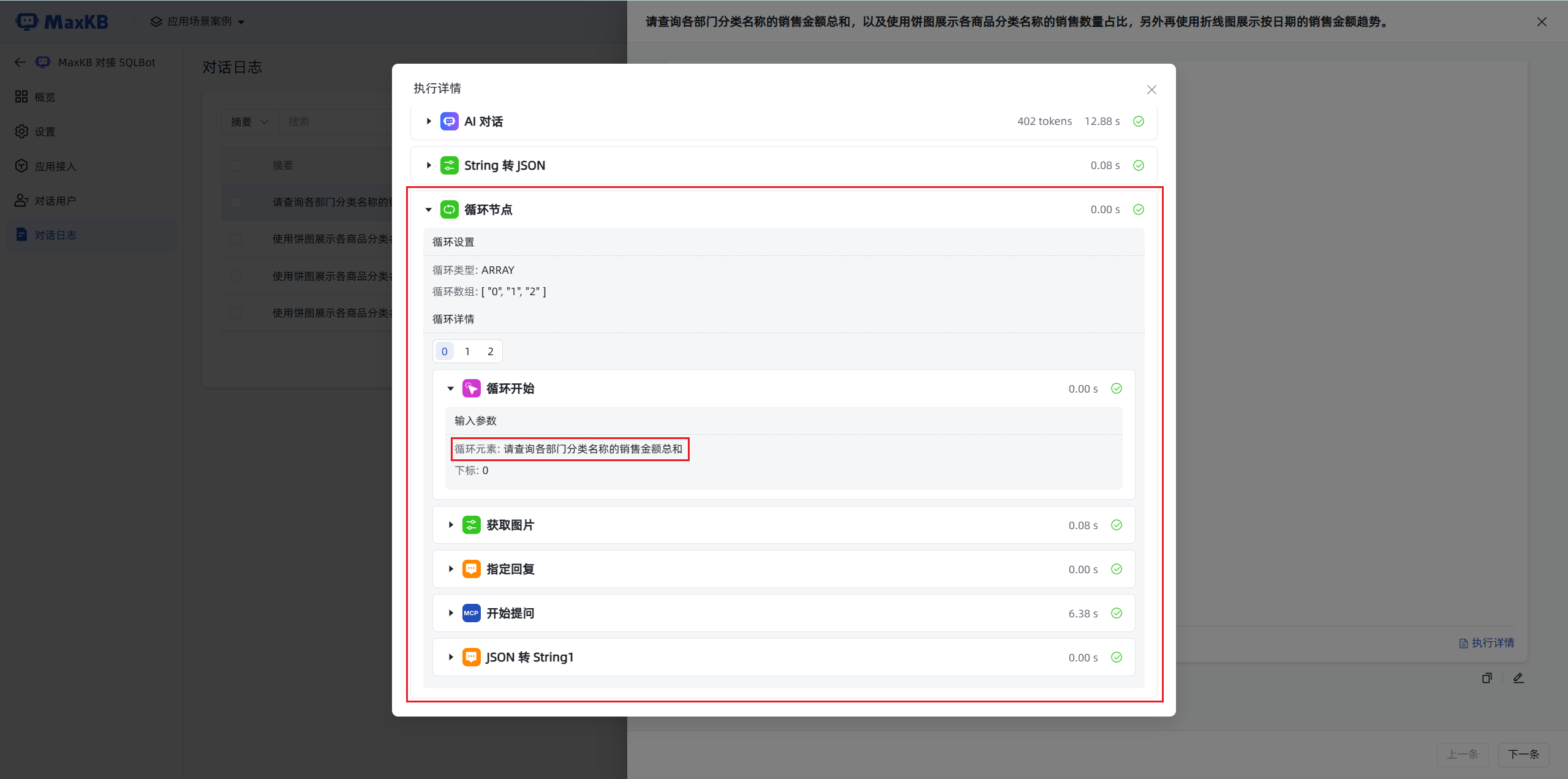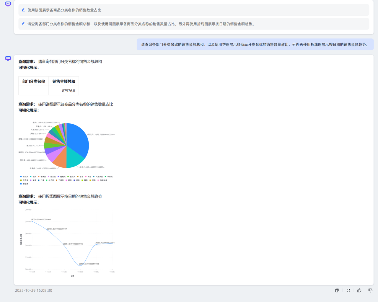在MaxKB的工作流中,我们特别设计了智能问题拆解和循环执行机制。当用户提出“请查询各部门分类名称的销售金额总和,以及使用饼图展示各商品分类名称的销售数量占比,另外再使用折线图展示按日期的销售金额趋势”这样的复合问题时,系统会自动将连续提问拆分成多个子问题,然后循环调用SQLBot服务逐一进行解答,最后整合输出完整的分析结果。也就是说,实现了从“碎片化问答”到“连贯式探索”的效果,具体效果如下图所示。
