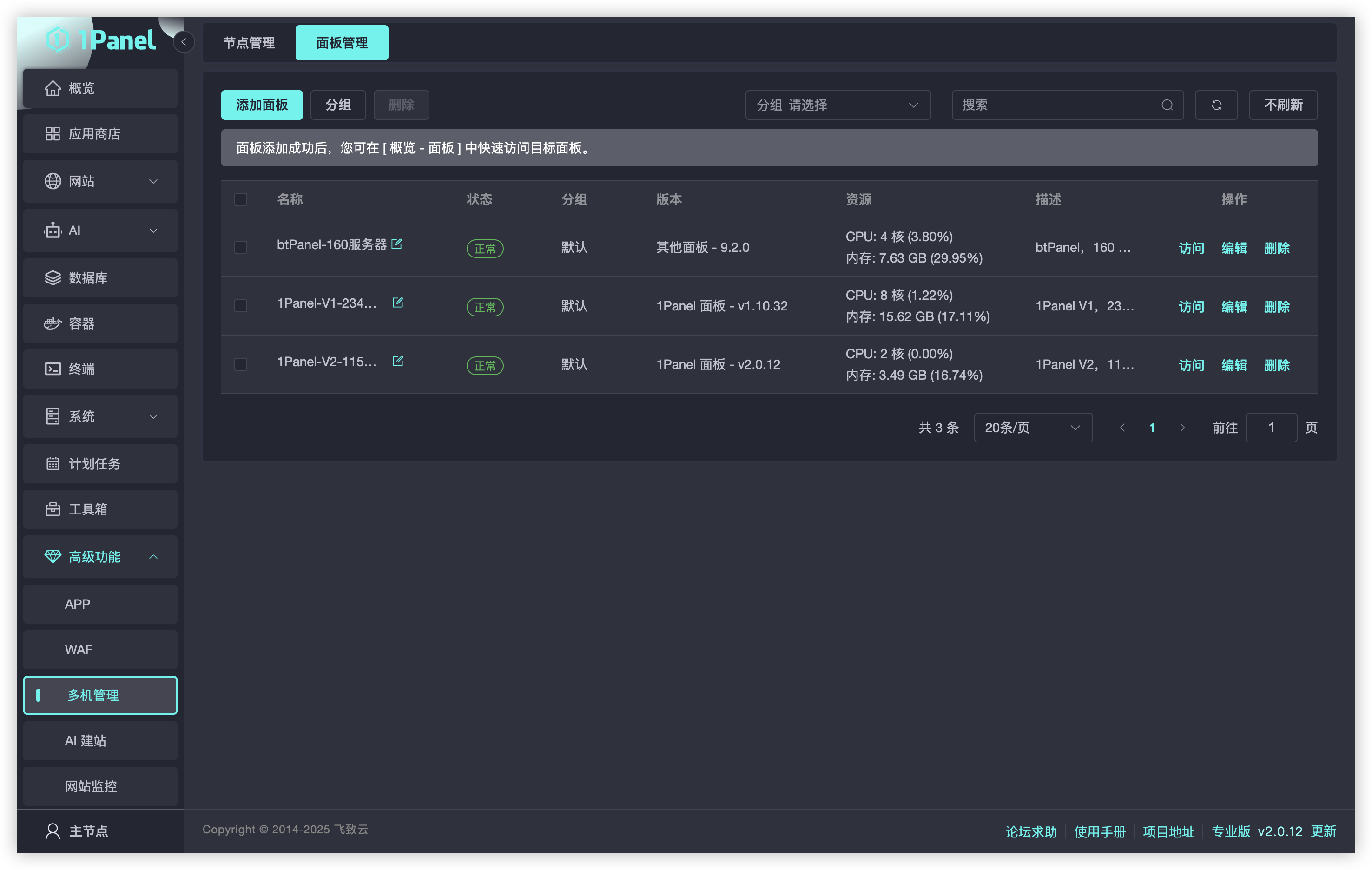 通过这一功能,用户可以在一个控制台中查看并快速跳转至不同服务器的管理界面,省去了频繁登录切换的操作。这一新增功能不仅提升了多服务器运维管理的效率,也为未来的多面板协同管理能力奠定了基础。